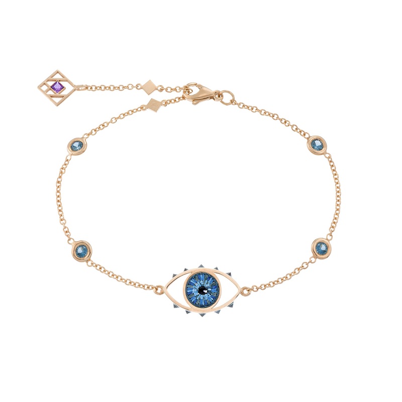 The Deep Blue Eye Bracelet is handcrafted from 18kt Fairmined rose gold with 4 round blue-grey sapphires, and a blue eye pendant comprised of hundreds of micromosaic pieces less than 0.5mm.Part of Kovadi's Look at Me Collection, combining modern design wit