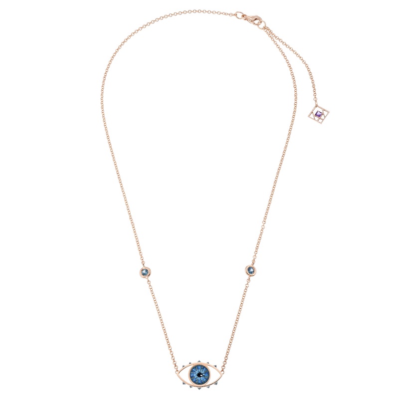 The Deep Blue Eye Neclace is handcrafted from 18kt Fairmined rose gold with 2 round blue-grey sapphires, and a blue eye pendant comprised of hundreds of micromosaic pieces less than 0.5mm.Part of Kovadi's Look at Me Collection, combining modern design with
