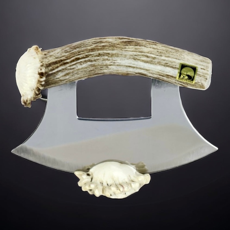 Made In Alaska Shed Deer Antler w/ Crown Ulu Knife5 1/2 Stainless Steel blade.Deer Antler Crown Stand is Included*Chopping board sold separately...