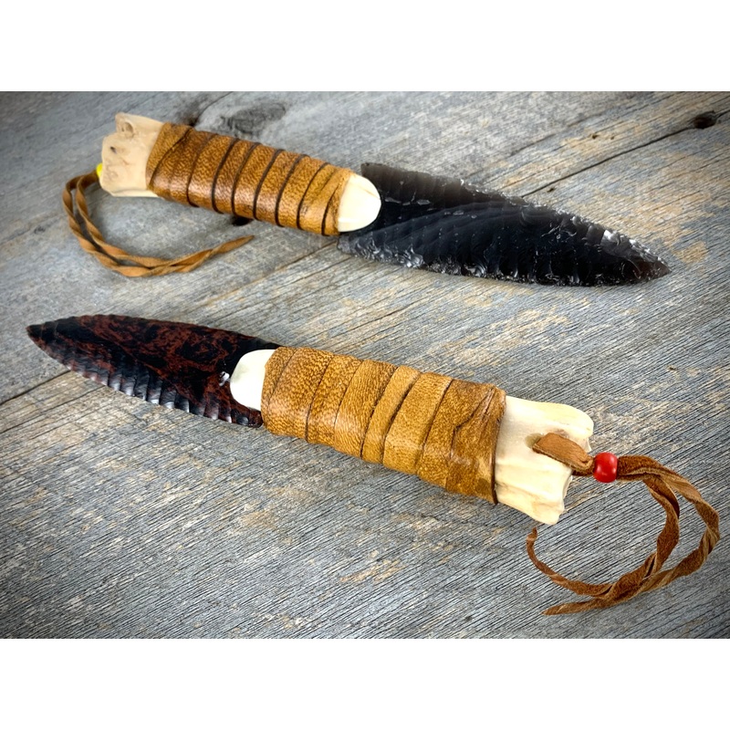 Handle is a Deer Leg bone and blade is made of Obsidian. Total Length: 9" inchesCertificate of Authenticity card includedStand Sold Separately...Purchase Medium stand for 9" Deer Leg Flintknapper, Dale Duby reproduce the stone tools and weaponry of vast by