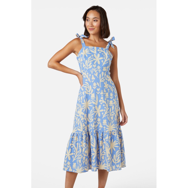 Two tone floral printed midi dress- meet Della, a stunning hand painted two tone botanical print. Perfect for sunny days- semi fitted bodice- tie shoulder straps- mid length style with a deep ruffle- made of a smooth linen, cotton blend- available in blueP