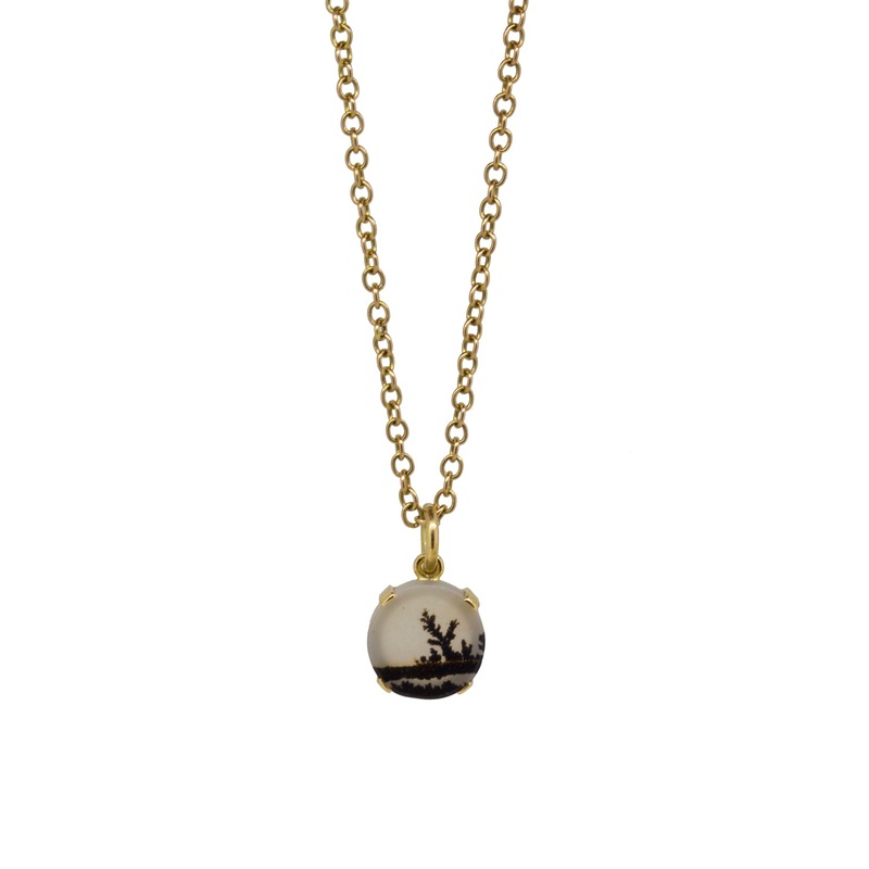 The Dendritic Agate Pendant is a Little Agate Disc necklace, hand cut from a one of a kind ethically sourced stone. These stones have an individual growth pattern meaning that no two stones are the same and each piece is unique.Hand crafted in the UK in 18