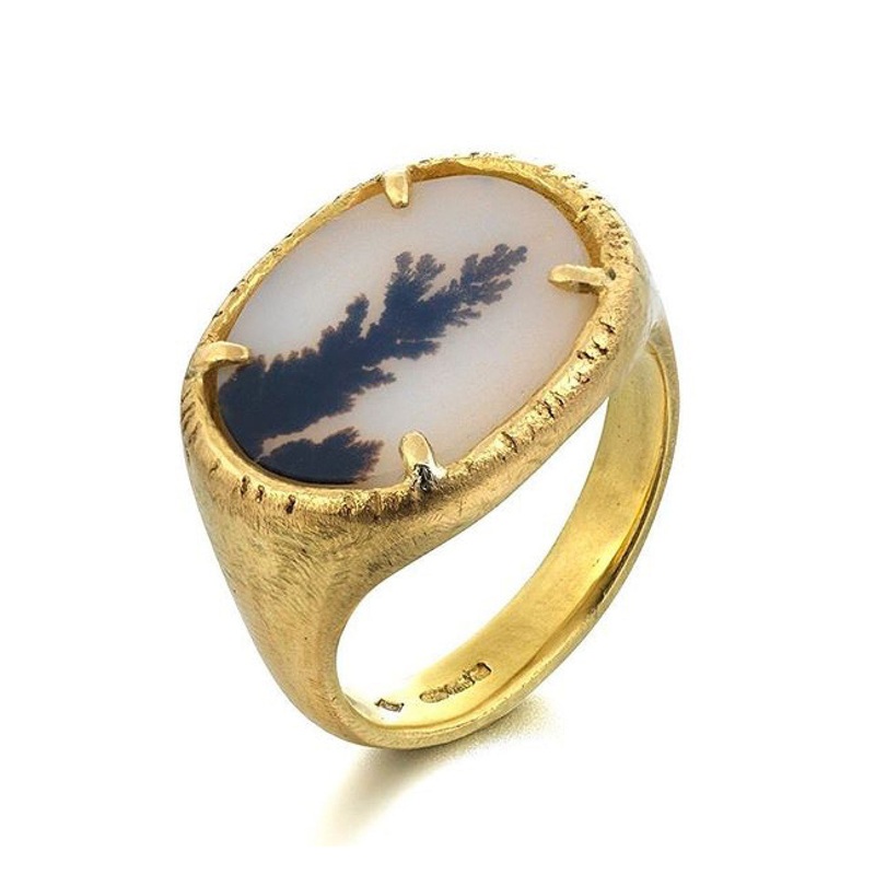 Dendritic Agate Ring has a hand etched finish and is part of the Sorrel Bay Collection inspired by The British Museum.One of a kind and hand crafted in UK this ring is unique and made from 18ct Fair Trade Yellow Gold.