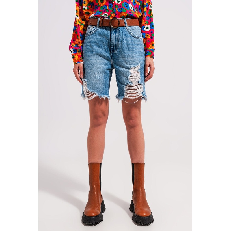 These fabulous light blue distressed 100% Cotton denim shorts promise that urban-chic aesthetic, with their high waist, frayed ends, five pockets, belt loops, and zip fastening. Balance the look with a floral shirt of cami, as shown in our photos. The mode