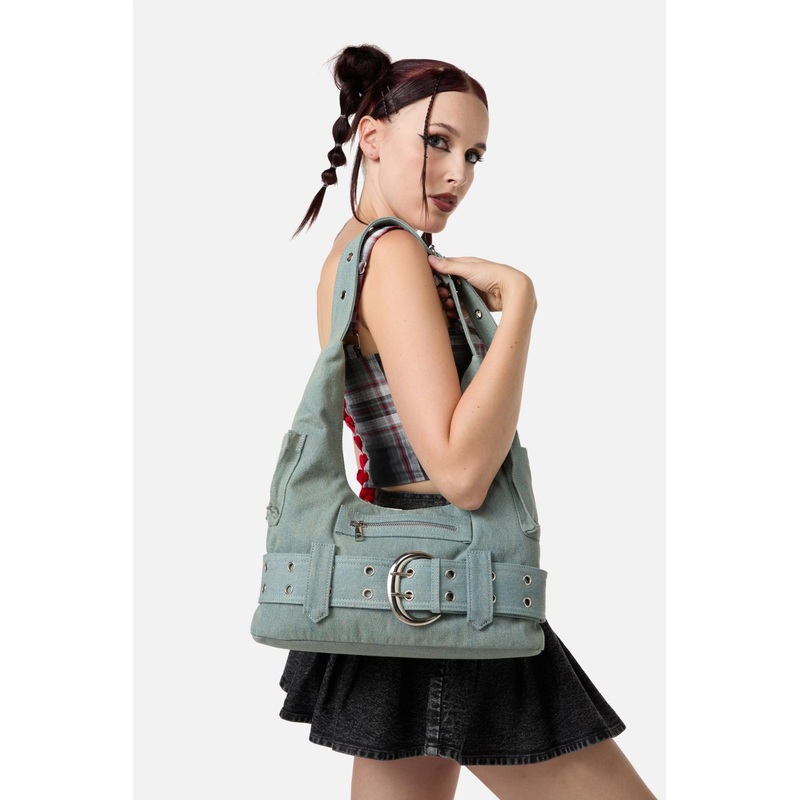 Denim Slouch Bag- A cool shoulder bag- Washed denim- Featuring large buckle eyelet belt like strap- Silver toned hardware- Adjustable shoulder strap- Zip closure- Approximately W=37cm, H=19cm, D=9cm Product Code: DWFZ118