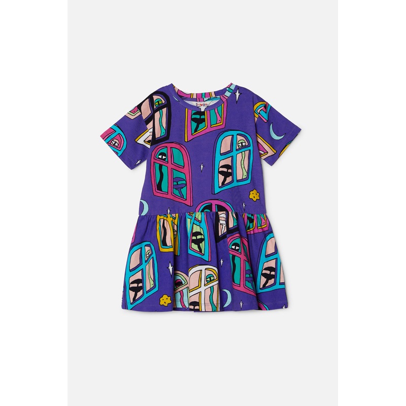 printed cotton relaxed fit dress - cotton rugby fabrication - short sleeve length- finishes at knee length - soft gathers at waist seam- colour blocking panelling - short sleeve length - rounded neckline- features exclusive kids print Product Code: DKGU036