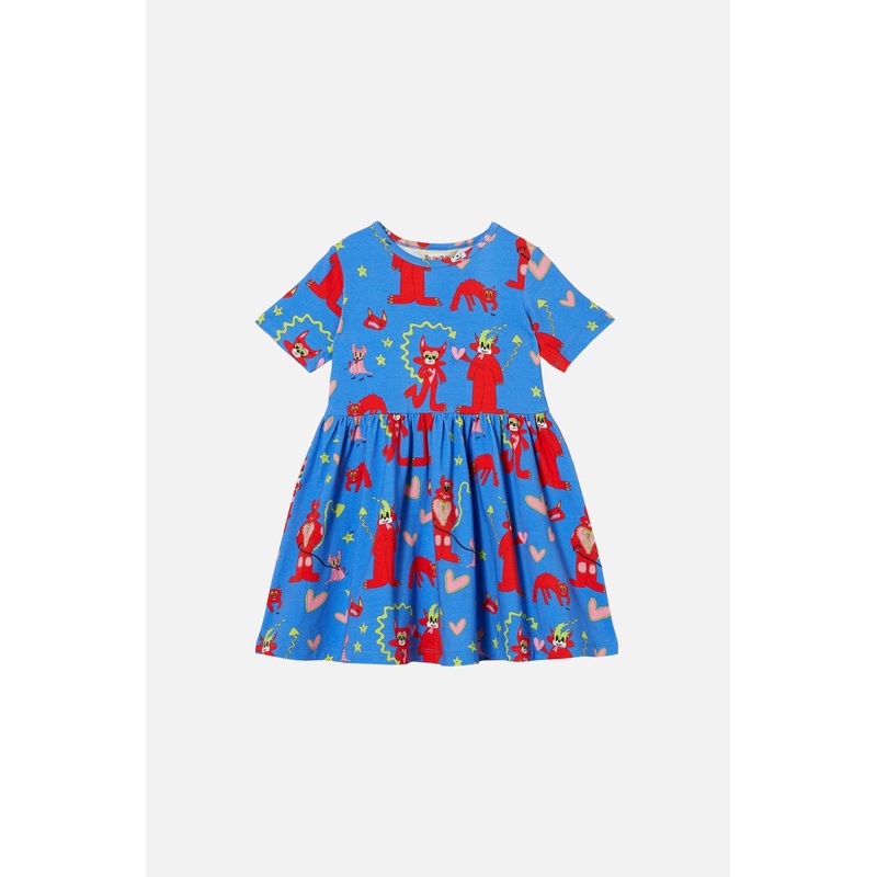printed cotton jersey dress- cotton elastane stretchy jersey fabrication- rounded neckline- short sleeve length - relaxed fit- finishes at knee- soft gathers at waist seam - perfect for everyday wear- features exclusive kids print