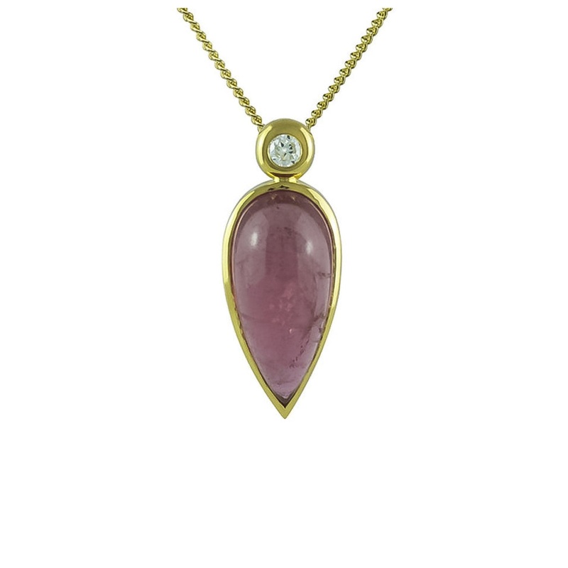 The Diamond and Pink Tourmaline Pendant showcases a pear-shaped pink tourmaline cabochon, delicately cradled in a yellow gold rub-over setting.Pink Tourmaline Cabochon: A 20mm pear-shaped pink tourmaline takes centre stage, radiating an irresistible charm.