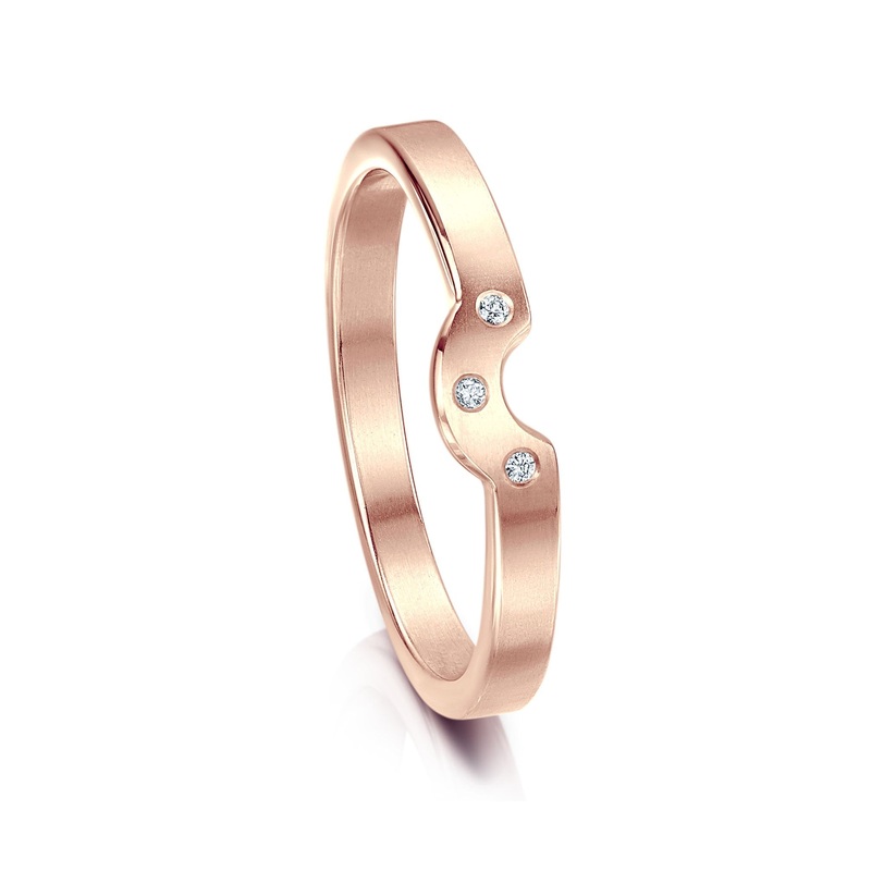 A wedding band with striking arch shape in warm 9ct rose gold and enhanced with three 1mm sparkling diamonds. A perfect match for Sheilas Contemporary 0.25ct Solitaire Diamond Ring.