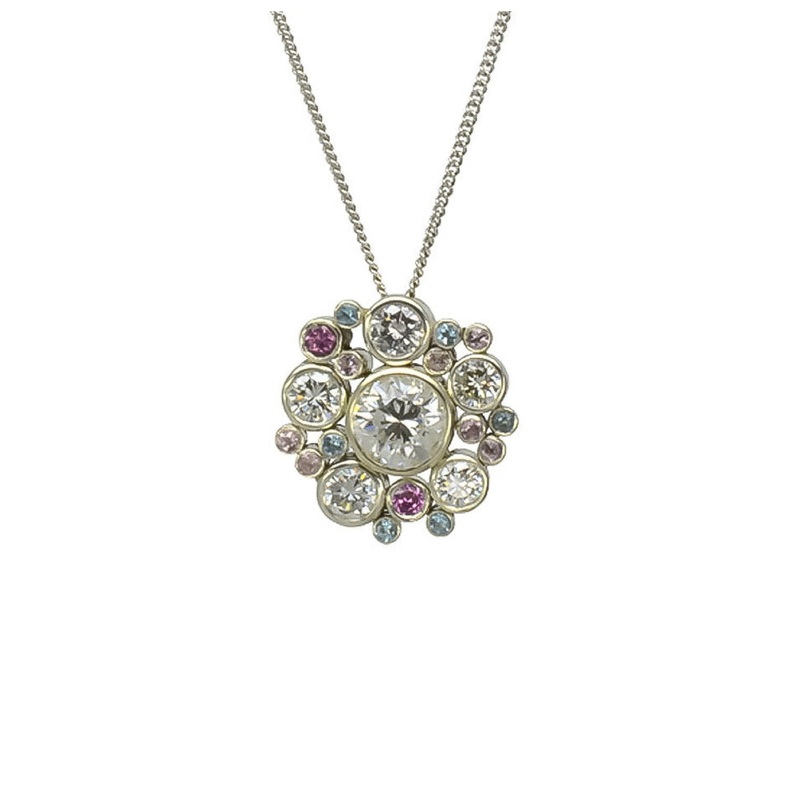 TheDiamond Cluster Pendant features a central diamond combined with aquamarines and vivid pink tourmalines.