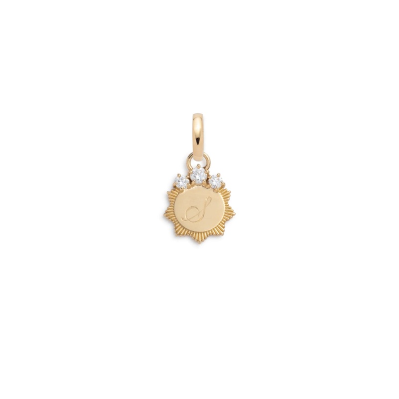 Handcrafted in 18 karat yellow gold, this customizable Diamond Engravable Miniature Medallion features a hand-engraved initial at the center topped with three diamondsthe birthstone for April. The name diamond originated from ancient Greek adamas which means untameable, invincible, and philosophers wrote about this legendary, unbreakable stone. A diamonds unique carbon structure makes it 58 times harder than anything else in nature