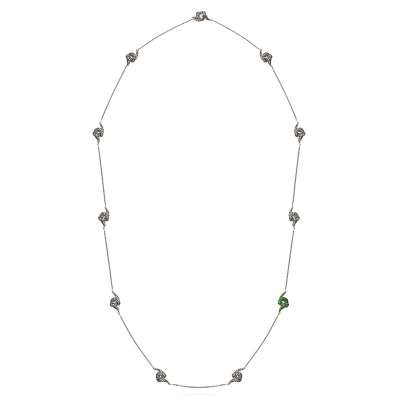 The Lust & Lure Single Strand Diamond Necklace with Emeralds features an elegant 18kt white gold, single strand chain interspersed with white diamond and emerald accents knots. this stylish and chic necklace is a classic from the Lust & Lure Collection by Leyla Abdollahi and works equally well worn as a glamorous piece for day or adds a final touch of sparkle to your evening look.The lavish and seductive Lust & Lure collection from Leyla Abdollahi, is a twist combination of two collections in one. Blending the colour schemes from the 1920s into voguish, stylish and modern jewellery with a distinctive touch of designer artistry, while intriguing curves and a carefully selected range of gems such as green emeralds, white diamonds and onyx prevail through the collection.