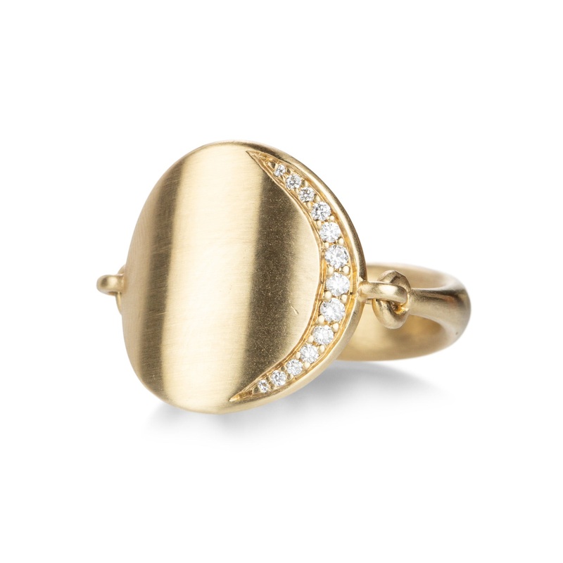 Slip into something luxurious in this 14k yellow gold ring from Nicole Landaw. A round plate with a diamond moon sliver is linked to a beautifully tapered band. With slight movement to the diamond element, this ring is unique in its form and feel. Centerpi