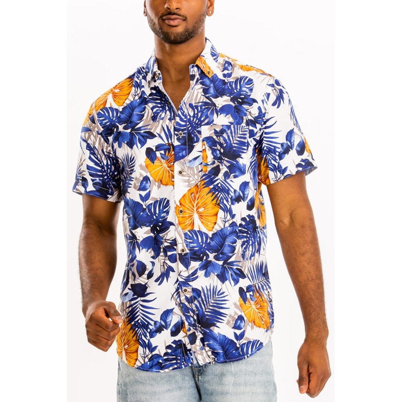 Digital Print Hawaiian Short Sleeve Shirt-Blue & Gold on White Background