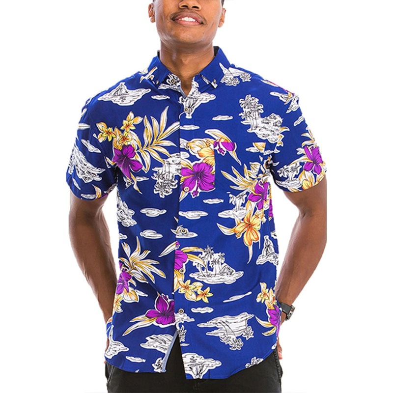 Digital Print Hawaiian ShirtSingle Chest PocketCollaredRegular FitModel Is 5'11 wearing a Size Large55% Cotton 45% Polyester
