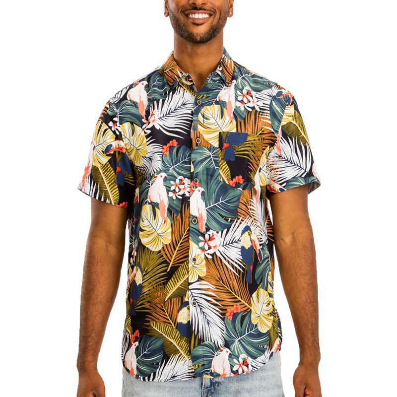 Digital Print Hawaiian ShirtSingle Chest PocketCollaredRegular FitModel Is 5'11 wearing a Size Large55% Cotton 45% Polyester