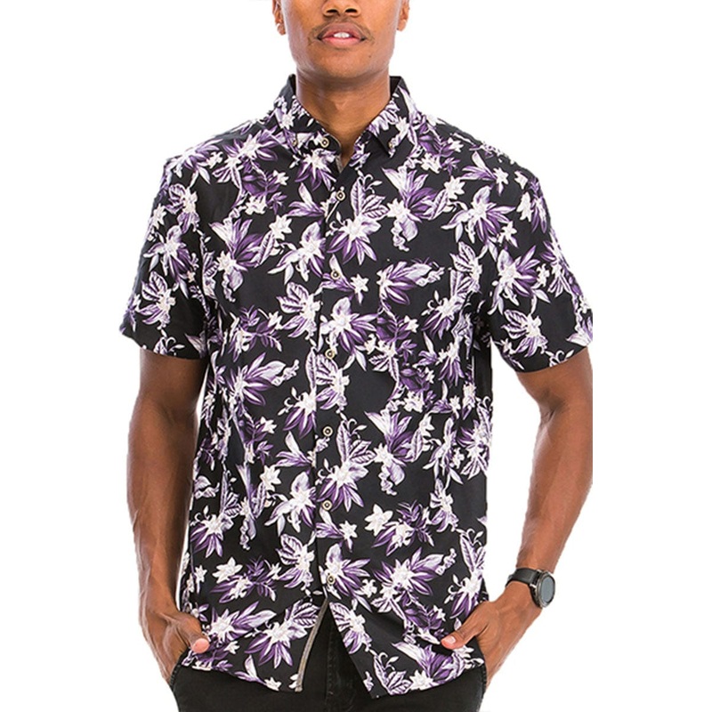 Digital Print Hawaiian ShirtSingle Chest PocketCollaredRegular FitModel Is 5'11 wearing a Size Large55% Cotton 45% Polyester