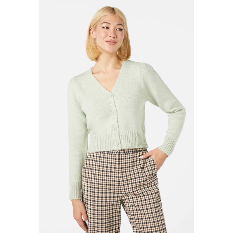 Fluffy long sleeved cardi- cosy up up in this sweet fluffy cardi- v neckline- button down front opening- ribbed hem and sleeve cuff- full length slightly puffed sleeve- relaxed fit- made of a cosy wool, acrylic, nylon, spandex & polyester blend- available