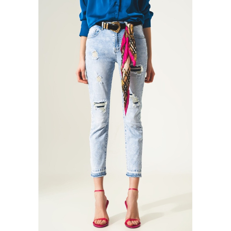 Distressed Straight Jeans With Hem Detail In Blue