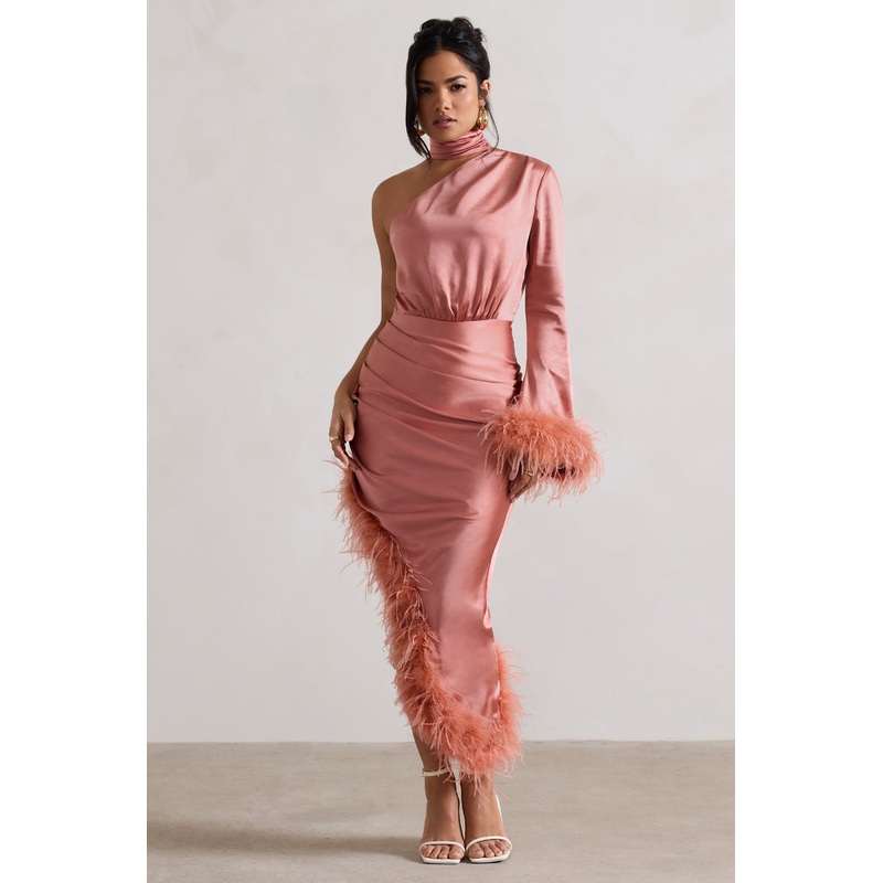 Cut from a shimmering coral satin,Dolceskims your curves before falling to an elegant asymmetric hemline. Trimmed with luxurious feathers, this lavish maxi dress is finished with a singular flowing sleeve and halter collar. Team yours with some gold accents for the perfect wedding guest attire.