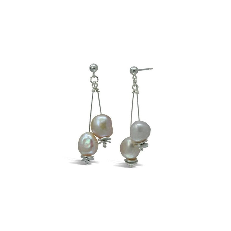 The Double Pink Pearl Drop Earrings feature two pearls measuring 10-13mm in length, elegantly strung with solid silver 6mm handmade nugget beads and curved discs.Pearl Elegance: The pearls in these earrings radiate classic elegance with their lustrous beau