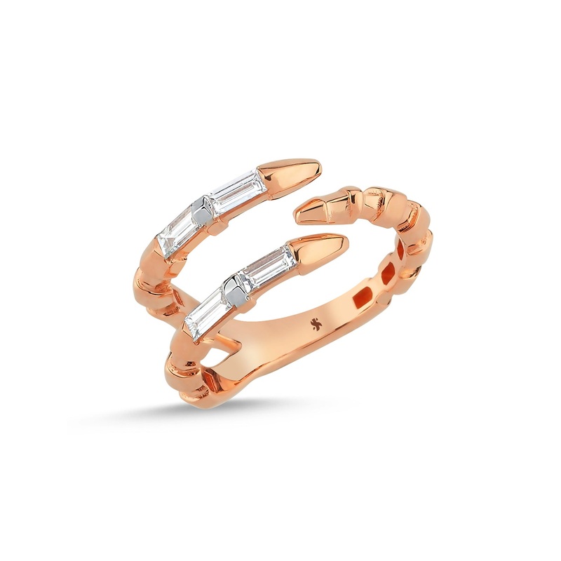 TheDragon Claw Pinkie Ring is made fromcertified Fairtrade or recycled 14K rose gold, featuring responsibly sourced baguette white diamonds.The iconic Dragon Lady Collection fromSelda Jewellery is inspired by the fire element which represents our life ener