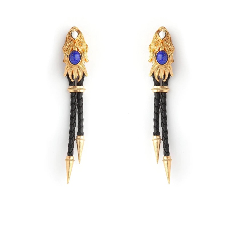 These statement bespoke Dragon Fish Black Gold Earrings are both bold and unique. The earrings are handmade from 24 carat gold overlay and are designed with a pear shaped simulated white agate cabochon and an oval, simulated blue lapis lazuli cabochon. The