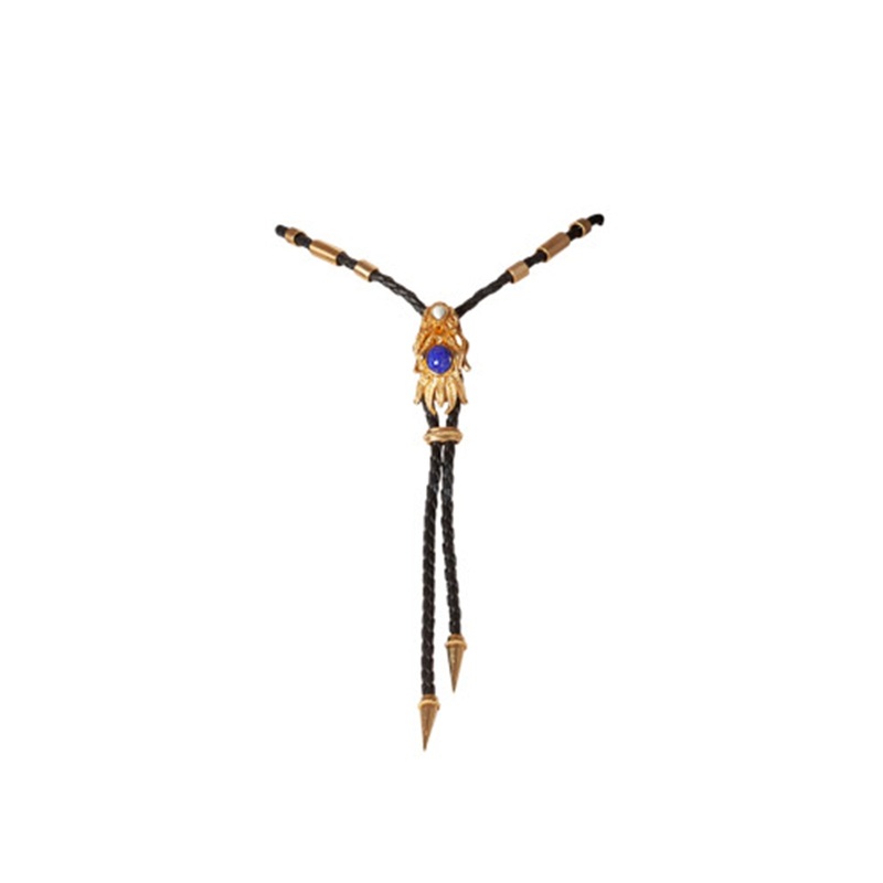 TheDragon Fish Black Gold Necklace.Inspired by Western-style bolo ties, this handmade lariat necklace with braided leather features a unique dragon fish, symbol of strength and perseverance.The dragon fish is designed in the Rococo style, with a pear shape