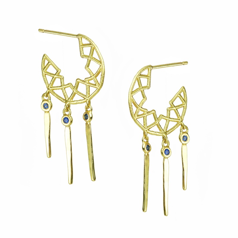 TheDreamcatcher Tassle Hoops aremade from18ct recycled gold, and feature 3 beautiful sapphires at the top of each gold 'feather'.Part of Claire Macfarlane Jewellery's Dreamcatcher Collection.The dreamcatcher is a protective talisman that is used to protect