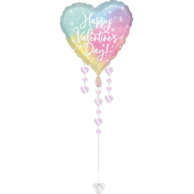 Illuminate your Valentine’s Day celebration with this pretty Drop-A-Line Luminous Valentines Day 81cm Foil Balloon with Tail. This 81cm heart-shaped balloon is a radiant expression of love, featuring a luminous rainbow ombre design that adds a magical touch to your festivities. The “Happy Valentine’s Day” message shines bright, creating a romantic ambience and attached to the end of the balloon is a beautiful balloon tail adorned with love hearts. Elevate your celebration with this glowing declaration of love and let your Valentine’s Day shine with warmth and affection. Combine with our range of Valentine’s Day balloons to mix and match and create the perfect scene for your party.