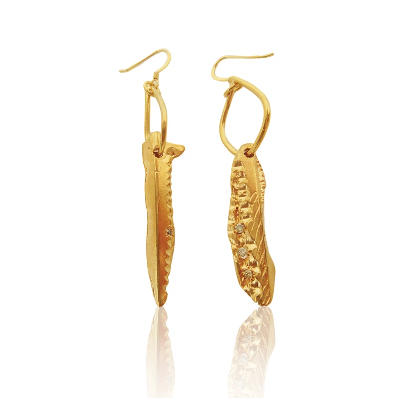 The Drop Dagger Earrings are an evocative pair ofearrings in Yellow Gold, set with 0.11 carat coloured diamonds.Part of the Amazonian Collection by Imogen Belfield. This fiery, brave and spirited collection fuses white porcelain and diamonds with 18k rose,