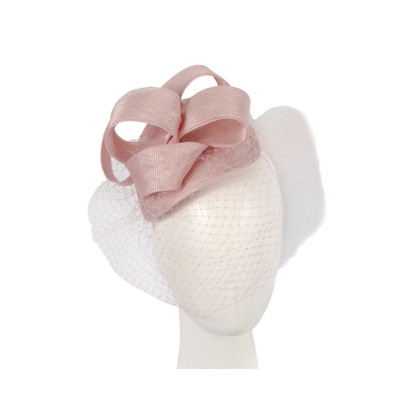 Elegant dusty pink sinamay fascinator with loops and face veil. A perfect choice for your next racing outfit. Designed in Australia Max Alexander brand Face veil Headband