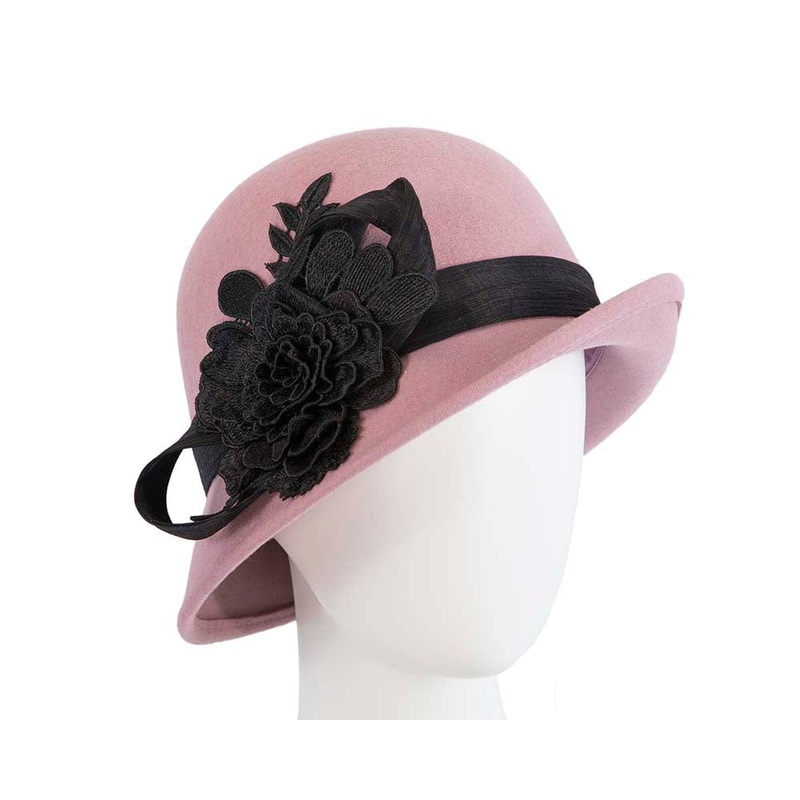 This dusty pink cloche hat is made from pure wool felt and draped with black silk abaca and luxurious lace ornament. Hand made in Melbourne, this bucket hat is perfect for winter racing events and special occasions. Made in Australia Cloche bucket hat Real