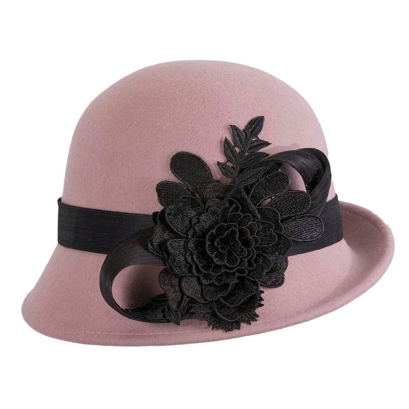 Fillies Collection by Cupids Millinery. Making hats and fascinators in Melbourne since 1963This dusty pink cloche hat is made from pure wool felt and draped with black silk abaca and luxurious lace ornament. Hand made in Melbourne, this bucket hat is perfe