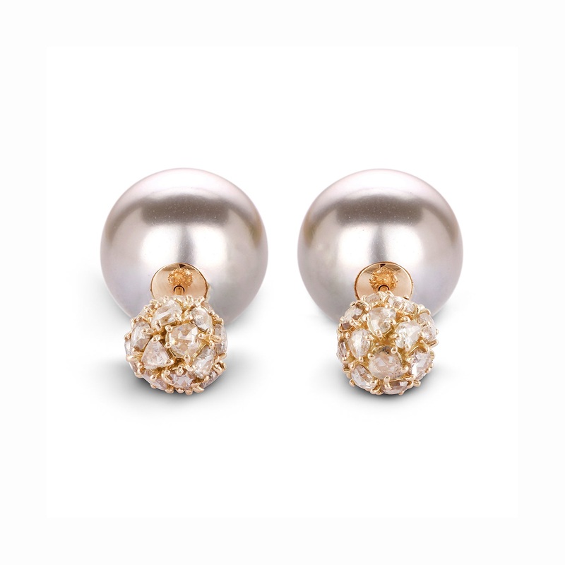 Earrings Zero 2 - Grey Pearl with Diamondsis a combination of lustrous grey pearl and polki diamond clusters set in yellow gold. This pair of earrings rests on the ear to give you a simple and graceful look.Part of the 10.18 launch collection of exquisite