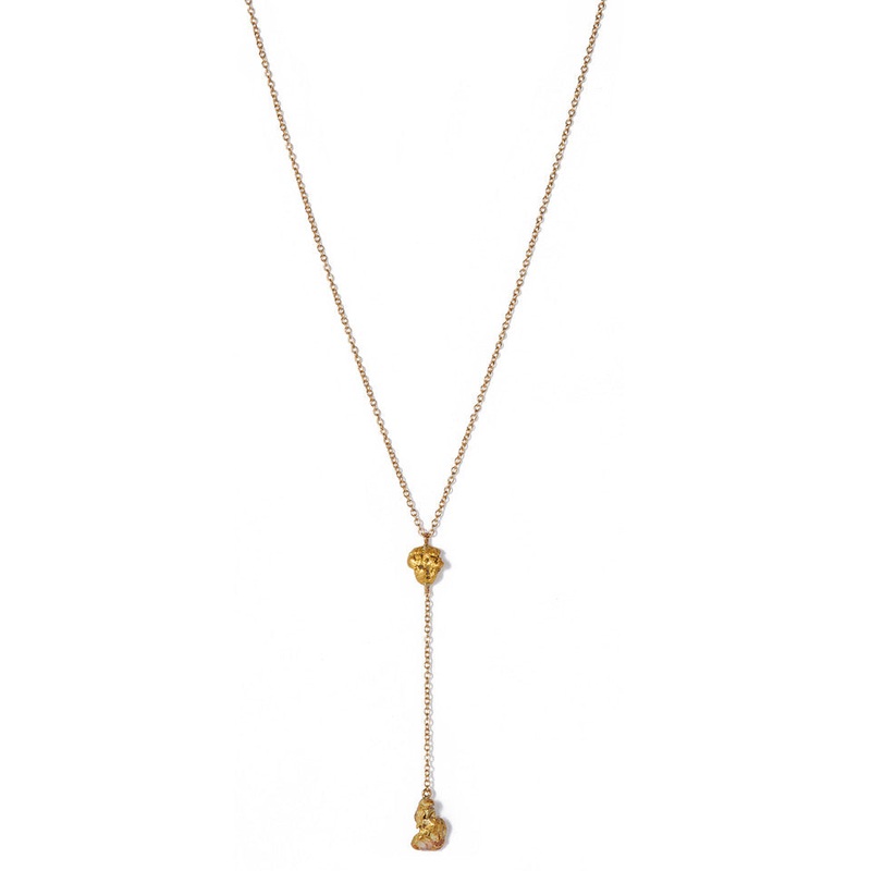 The Earth with Two Necklace is from the Earth line,made from 18kt Fairtrade Certified Gold and gold nuggets.This necklace has a minimalist and classical design featuring an elegant fine gold chain leading to a central nugget that supports a pendent gold nu