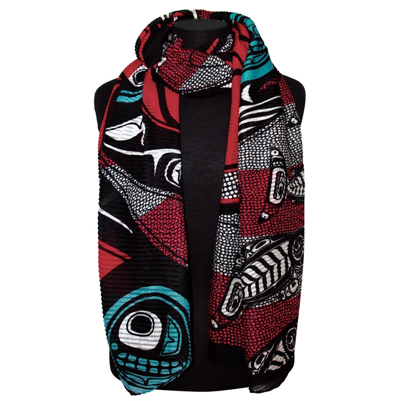 The extra soft and textured Eco Scarves use vibrant colours and eco-friendly materials to enrich their bold Indigenous designs. Native Northwest Eco Scarves were created using 100% recycled plastic bottles