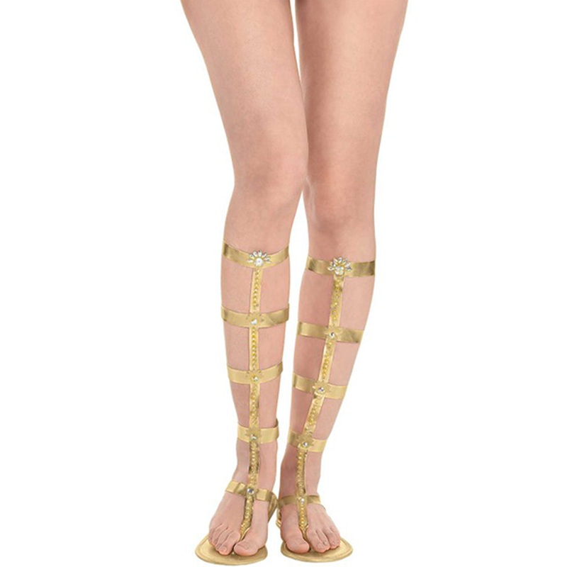 Item Includes:Sandals.Fit and Sizing:One size fits most.Sole measures 26cm x 9cm (10.2in x 3.5in)Cleopatra!Become an Egyptian goddess of old with our Egyptian Jeweled Women Sandals. Featuring a pair of jewelled Egyptian sandals, styled with gold like leg w