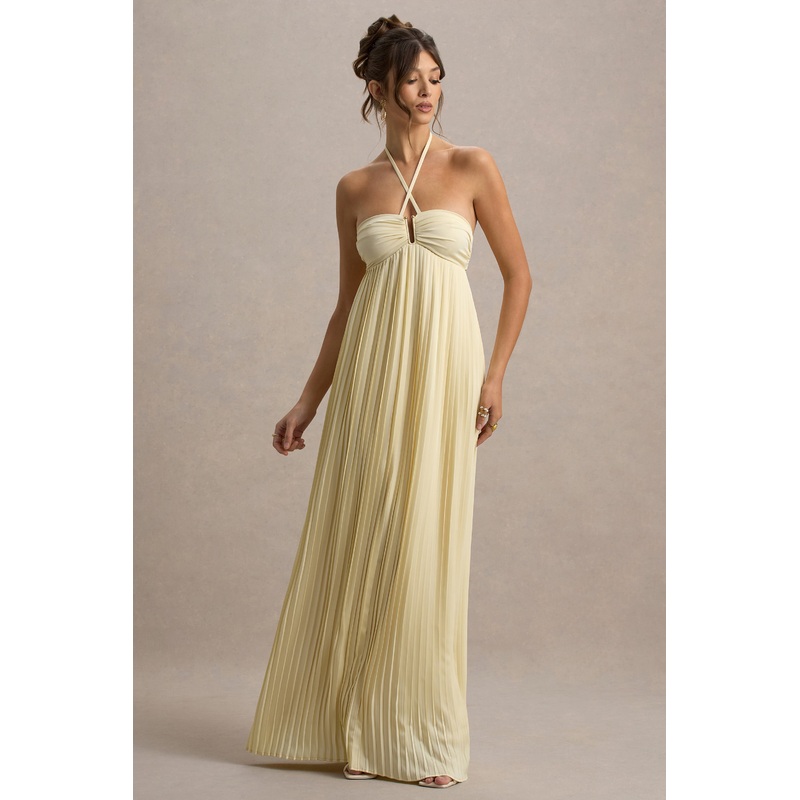 Radiate effortless elegance in Elayne the must-have maxi for sun drenched celebrations and unforgettable evenings. Designed in our premium stretch satin in a pale lemon hue, this dress cascades beautifully with a flowing pleated skirt, creating graceful movement with every step. The striking gold U-shaped detail at the chest adds a luxe touch, while the functional halter neck tie allows for a flawless, adjustable fit. This maxi will be your go-to for summer events and rooftop cocktails this season.