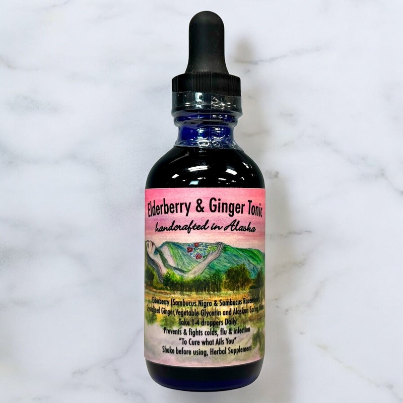 Immune-boosting, Cold-fighting respiratory rescue! Naturally Awesome Ginger Tonic ~ 2 ounces. Harvested & Blended in red Alaskan Sambucus Racemosa with black Sambucus Nigra