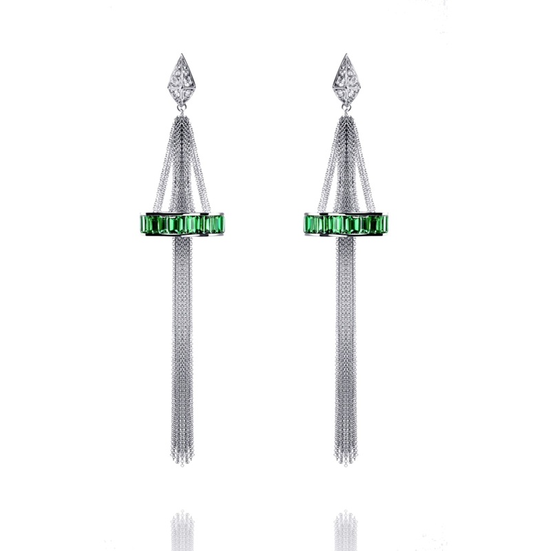 These stunning Electric Night Chandelier Earrings set in 18ct Gold with Baguette stones of emerald and white diamonds are a real party piece. These versatile earrings come in two parts and can be worn as simple studs for a chic everyday look, or worn with