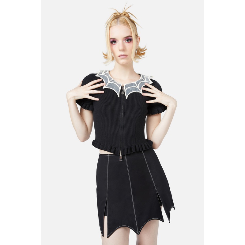 Gothic Cardigan- Short Sleeves- Fitted Shape- Double-Ended Zip Closure- Removable Spiderweb Crochet Collar- Made From Soft Knitted Cotton- Available In BlackProduct Code: BGFY133