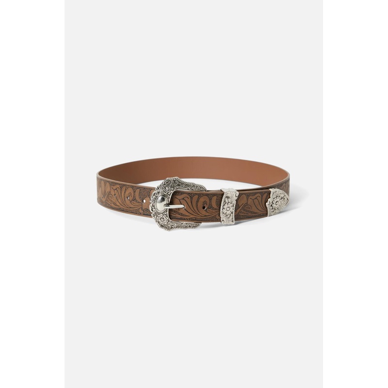 Embossed Buckle Belt- A pretty and cool belt- Detailed and ornate buckle- Floral inspired belt design- Vegan leather- Available in tan- Hardware silver in colour- Comes in sizes XS, S, M and LProduct Code: PWFZ103