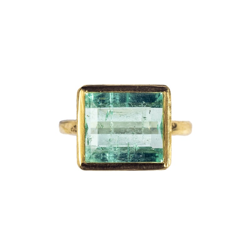 TheEmerald Colette Ring features a stunning apple green rectangle shaped emerald. The gemstone has been rub set in 18ct yellow gold SMO with a texturedhammered finish.This ring has been handmade in India Mahons Harrogate studio.