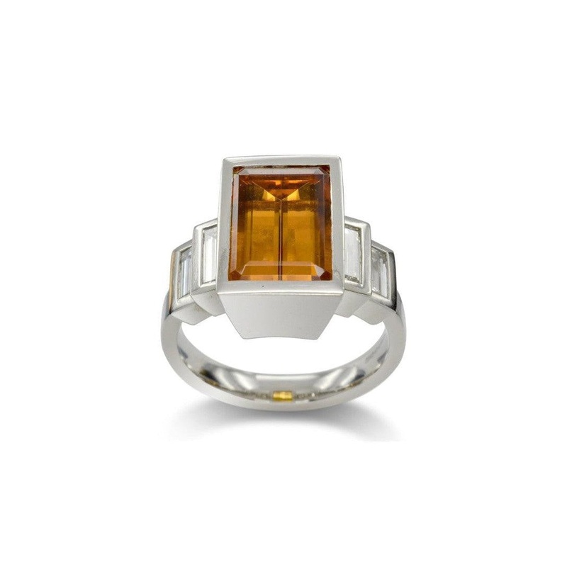 The Emerald Cut Yellow Topaz and Diamond Platinum Ring is a beautiful combination of vibrant colour and brilliance.