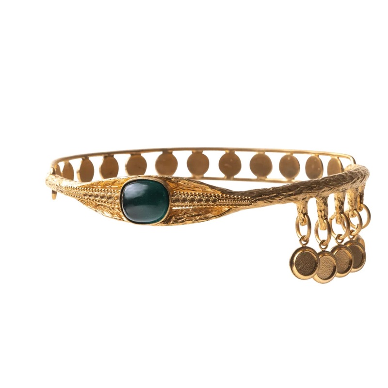 TheEmerald Eye Necklace.Sonia Petroff's vintage style 70's bespoke choker is so cool and trendy that it can be worn as an everyday statement or for evening glamour. Bezel-set with a simulated green emerald cabochon, within a tapering mount and dangling gol