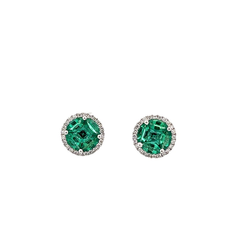 14 karat white gold Round Clover Stud Earrings containing 1.28 carat total of emeralds surrounded by 0.23 carat total of diamonds.