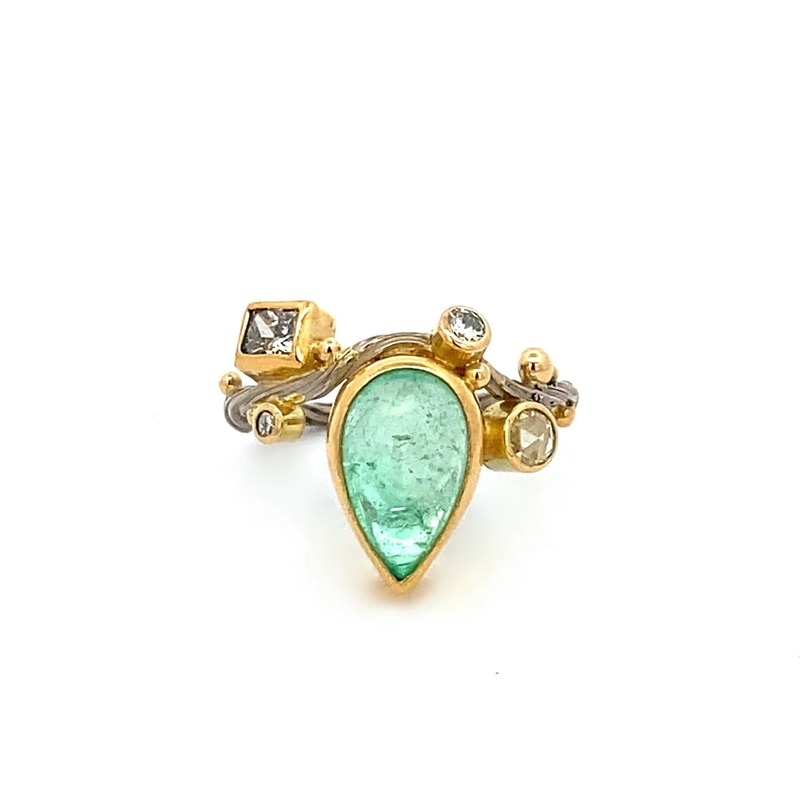 The Emerald Seafire Ring is hand made from recycled 18k white gold, 18k yellow gold and 22k yellow gold, and features an emerald and white diamonds.