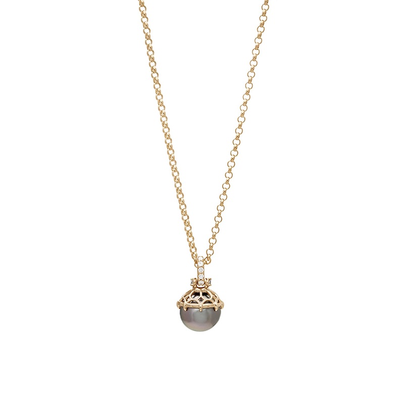 TheEmma Lace Cap Pearl Pendantfeatures a luxurious Sea of Cortez peacock Pearl with conflict-free 0.09ct inverted grey diamond and 0.05ct white diamond pave. The pendant is displayed on a16" recycled yellow gold rollo chain.Part ofAnna Sheffield'sEmma Lace