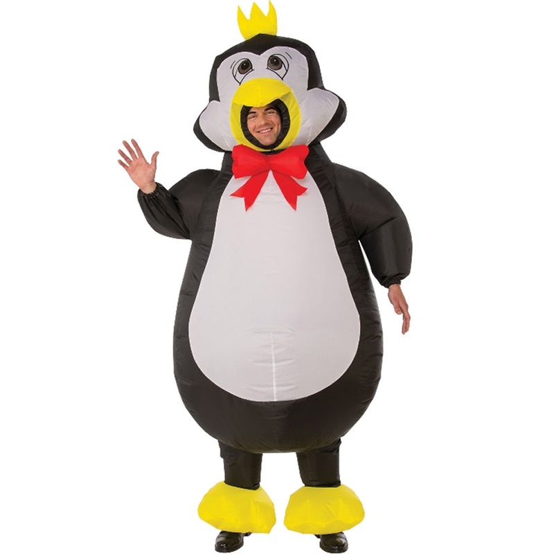 This Emperor Penguin Inflatable Adult Costume is perfect for a bit of fun at your next party. The costume is styled as an Emperor penguin with printed cartoon eyes, a black body, white belly and face, and yellow beak, feet and crown, as well as a large red bow tie around the neck. The costume easily inflates with the included battery operated fan (4 x AA batteries are required and not included) and features elasticated wrists and ankles, as well as a drawstring in the hood to tighten around the face to keep the air in. Perfect for some Happy Feet dance moves on the party dancefloor.